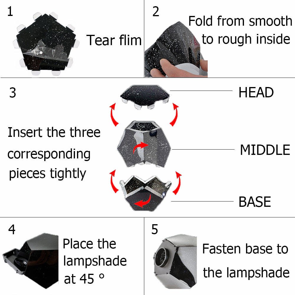 4. 4. Plcae the lampshade at 45° 5. Fasten base to the lampshade