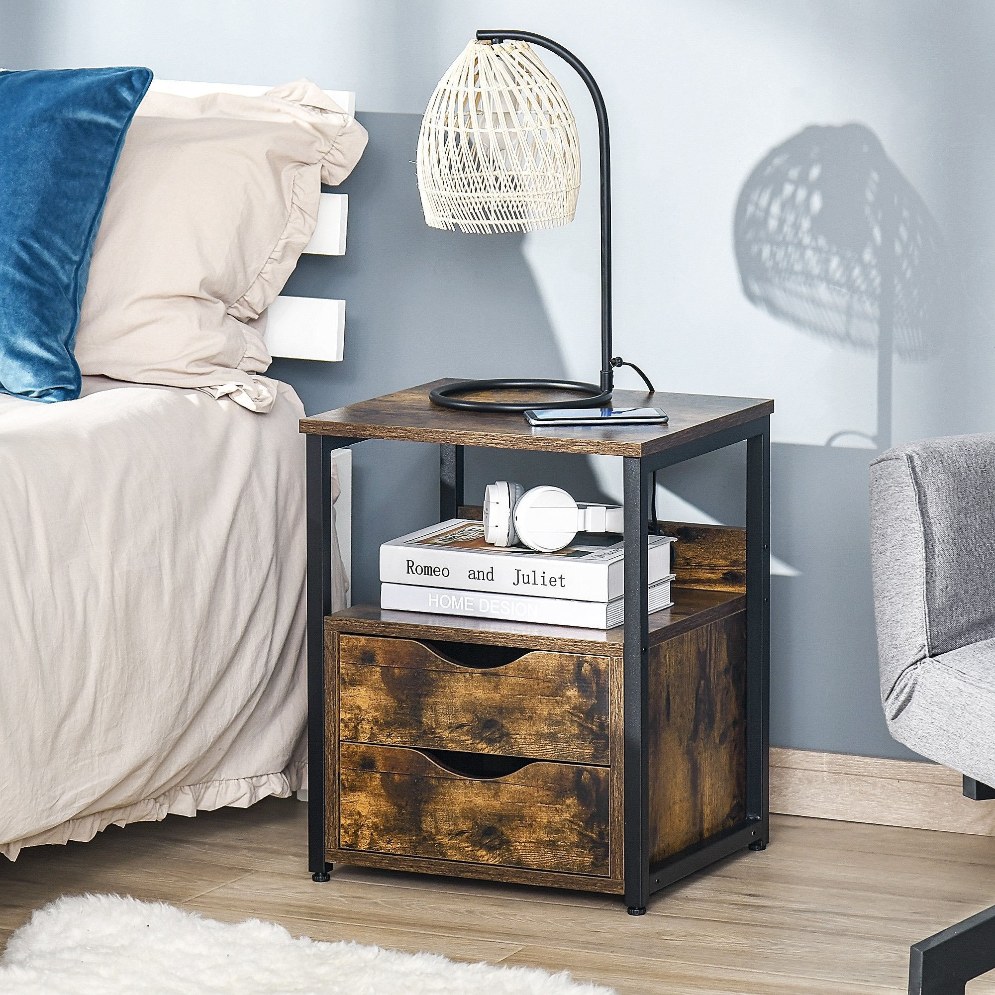 HOMCOM Industrial Side Table with 2 Drawers Accent Table Storage Shelf