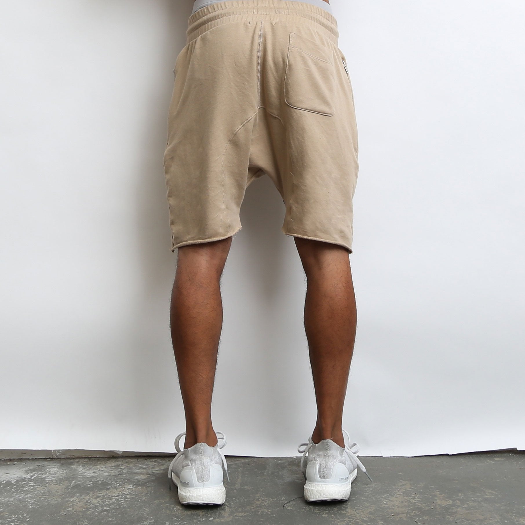 Drawstring enclosure at the waist, zip pockets, and a raw hem