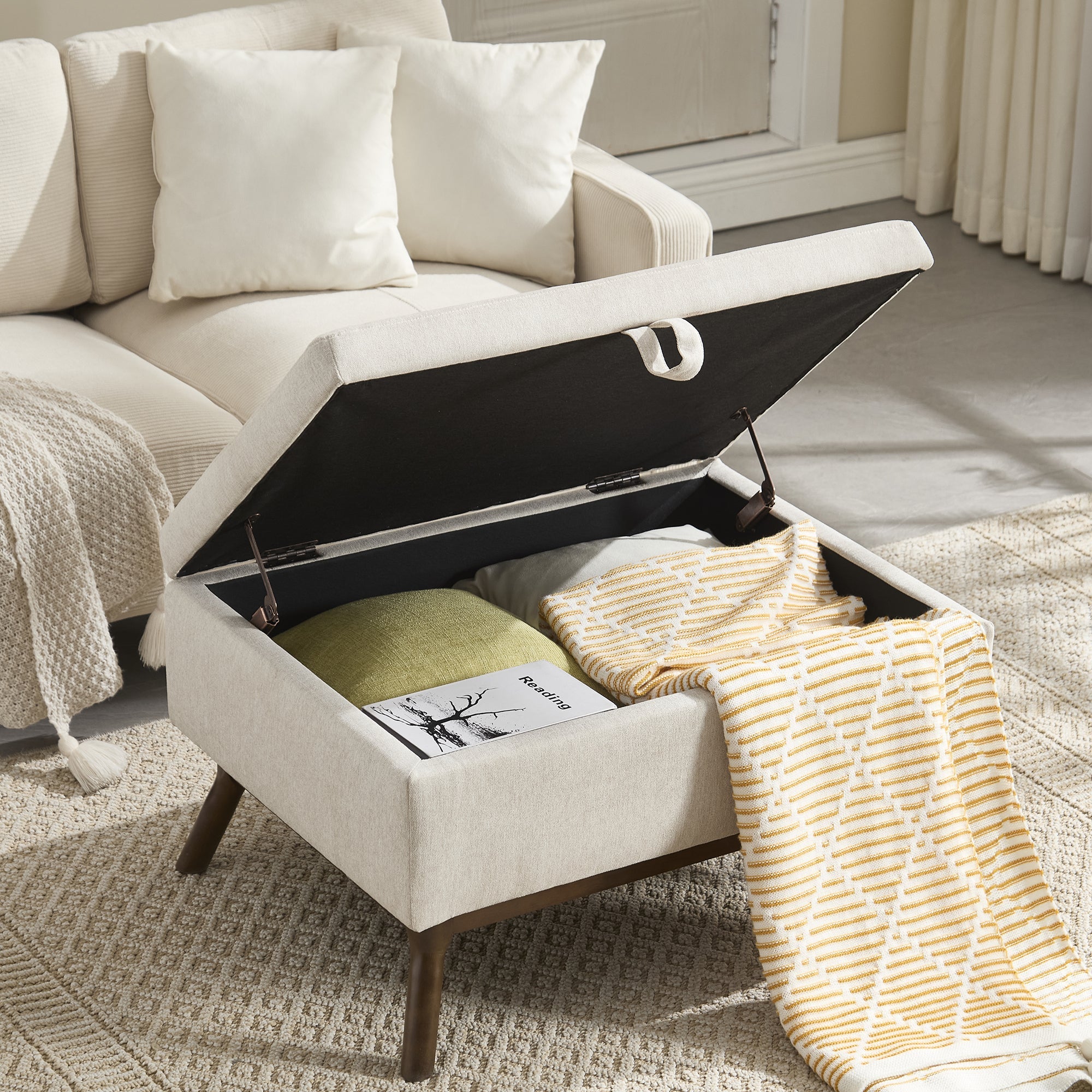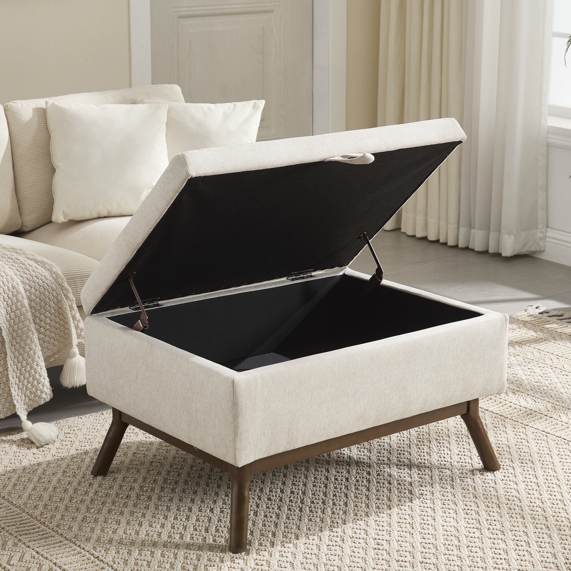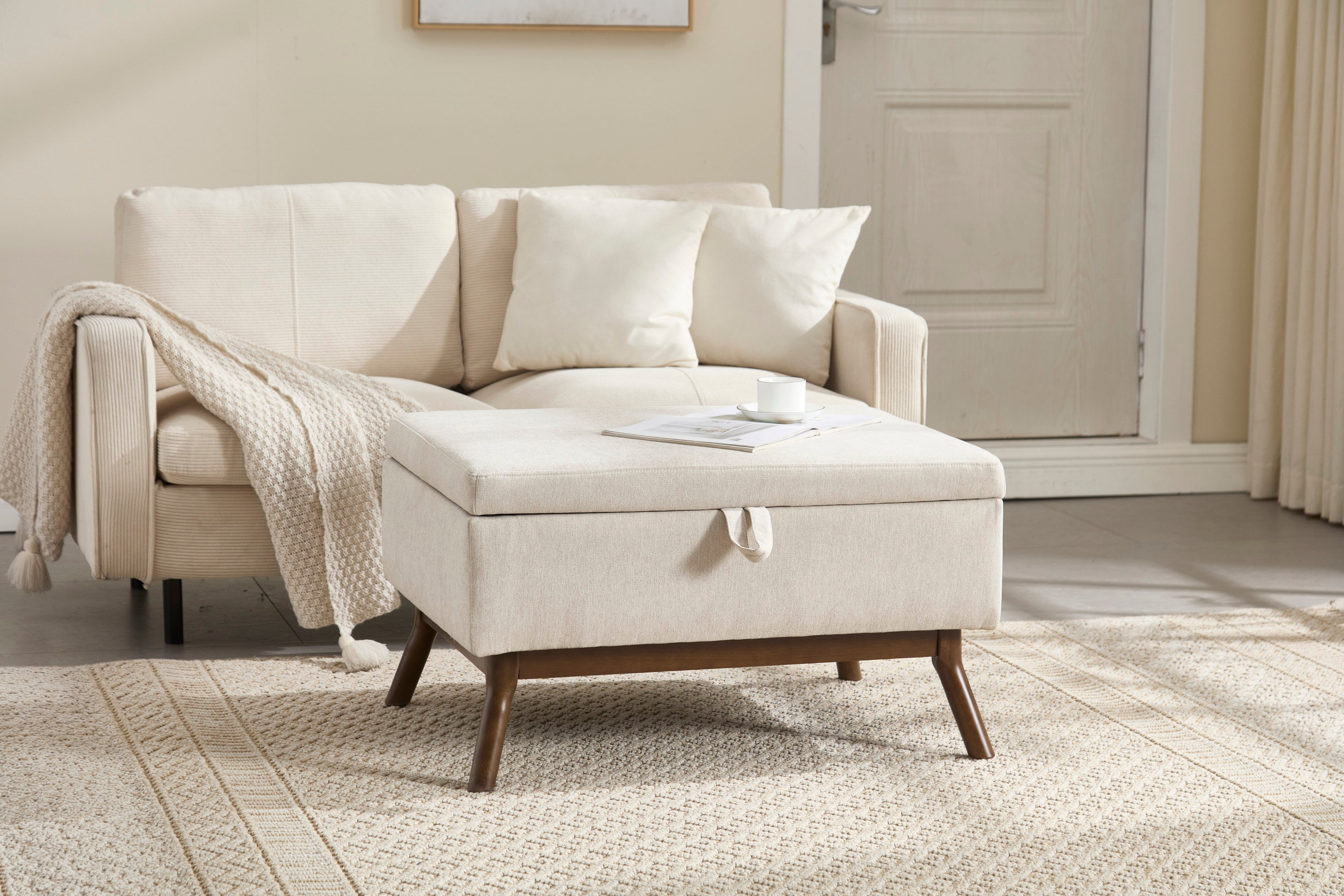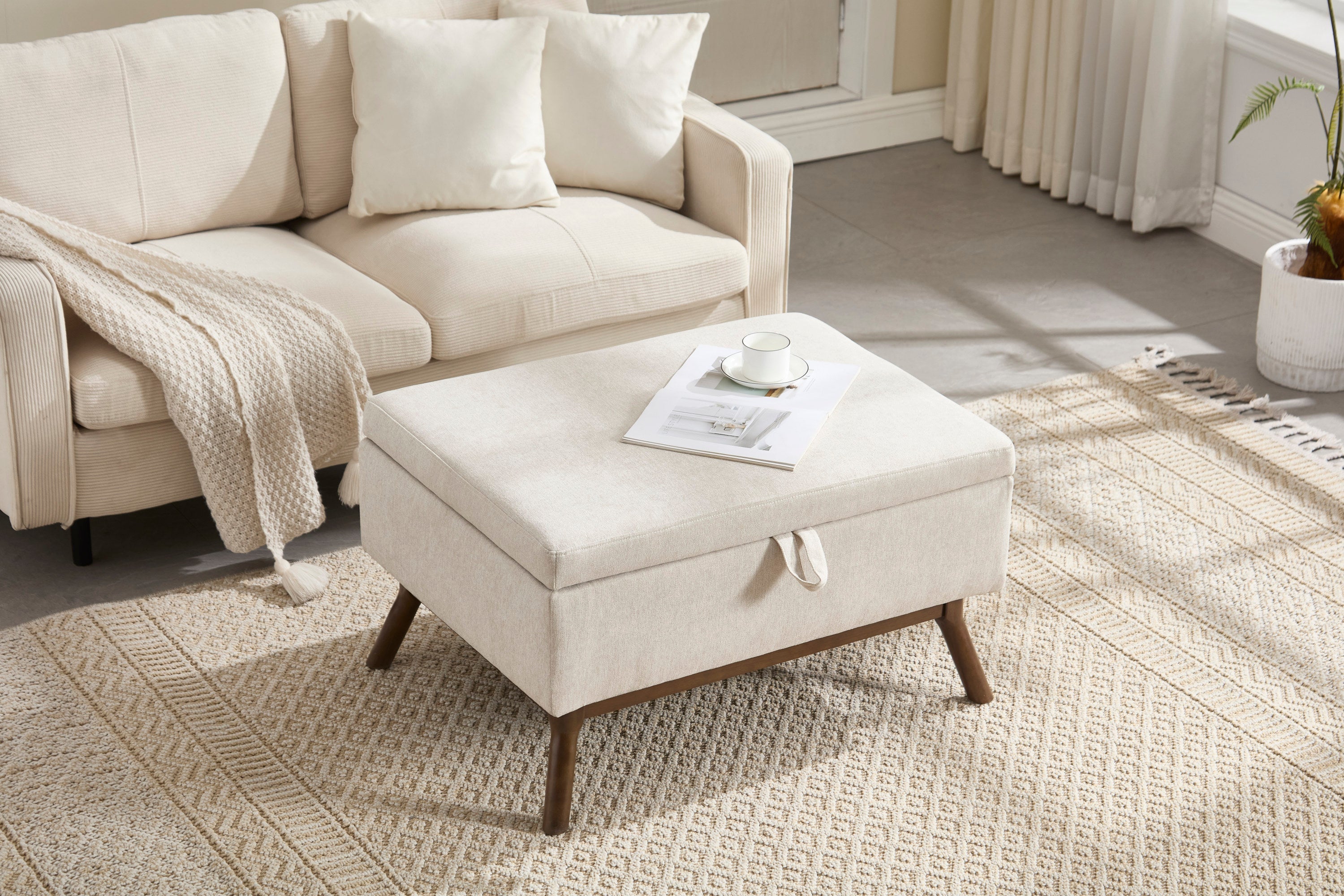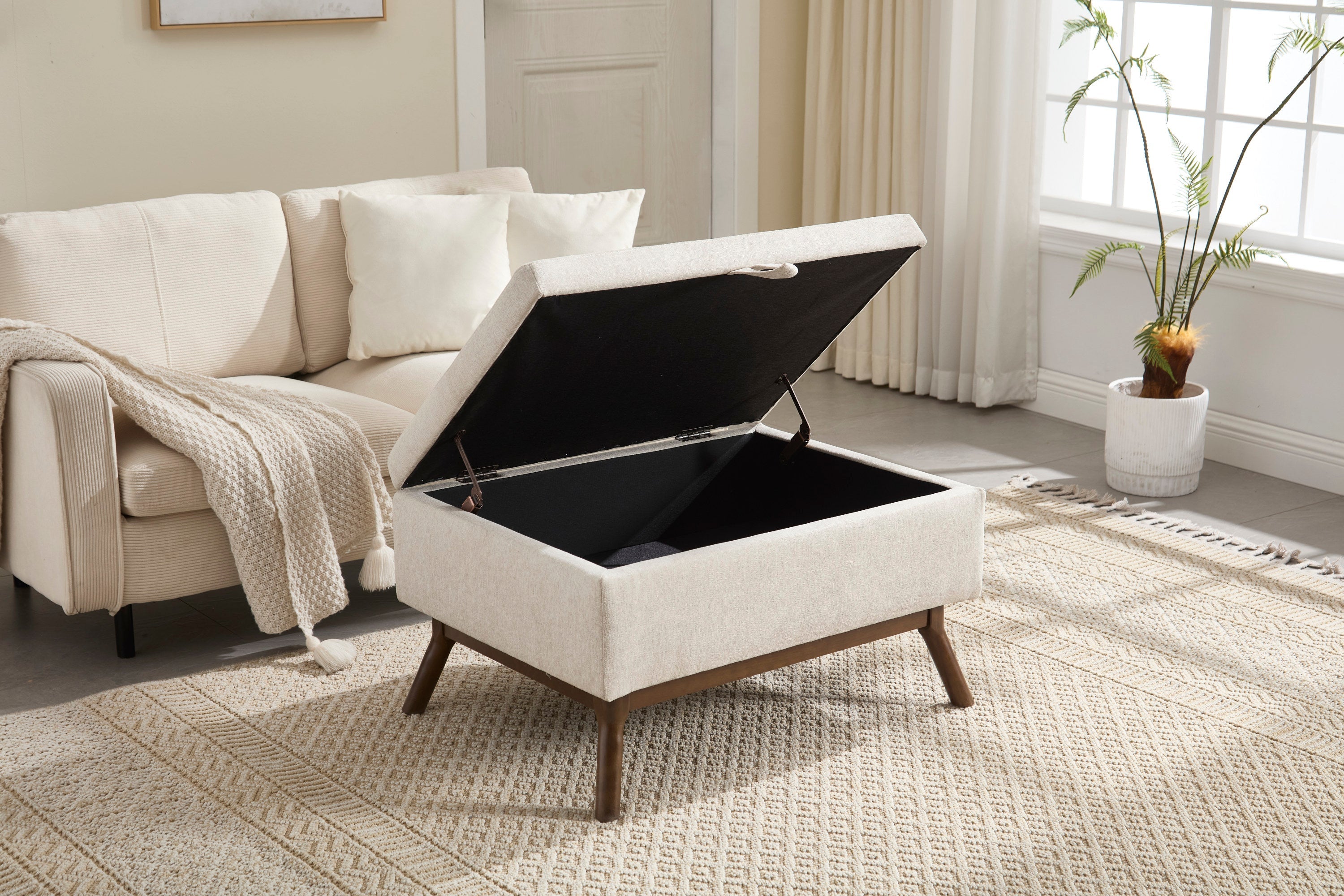 Mid-century modern square coffee table storage bench, assembled,